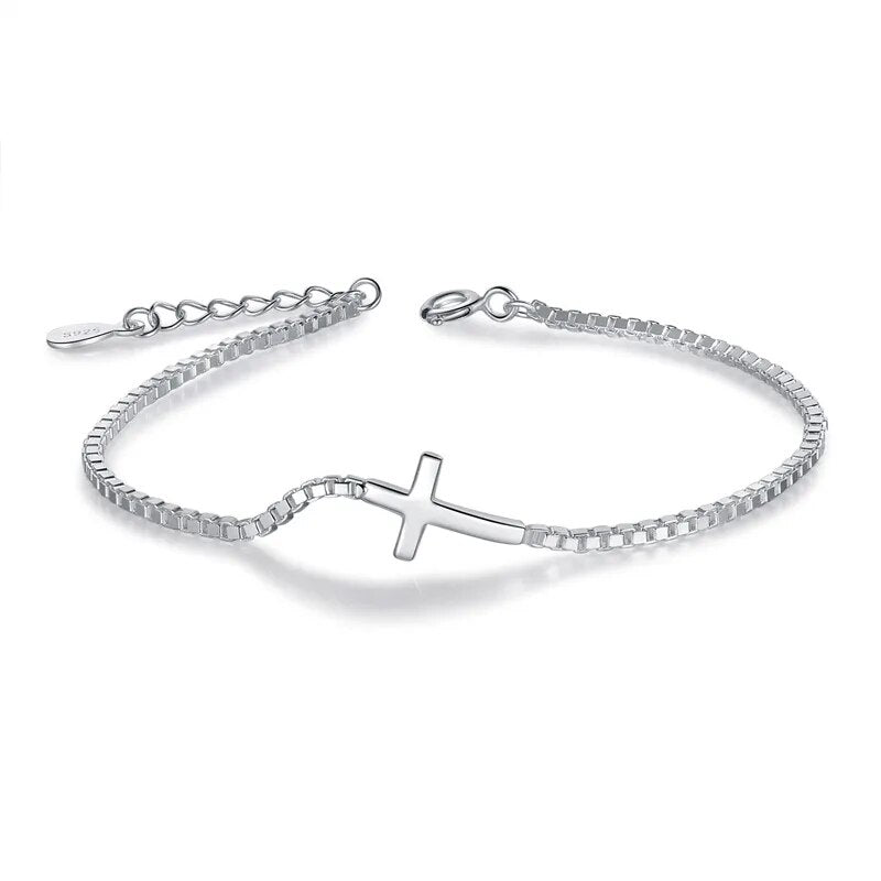 This magnificent cross bracelet invites you to explore the timeless beauty of design and Christian symbolism. Beautifully crafted, it features an elegant square link chain that harmoniously complements its cross-shaped pendant, positioned horizontally at the center. This silver-toned piece, enhanced with a practical clasp and an extension chain, embodies understated sophistication and a subtle affirmation of faith. Perfect for everyday wear, this cross bracelet easily pairs with any wardrobe, adding a delicate and personal touch.