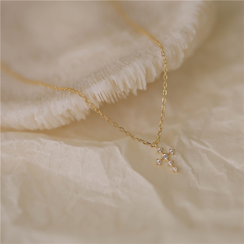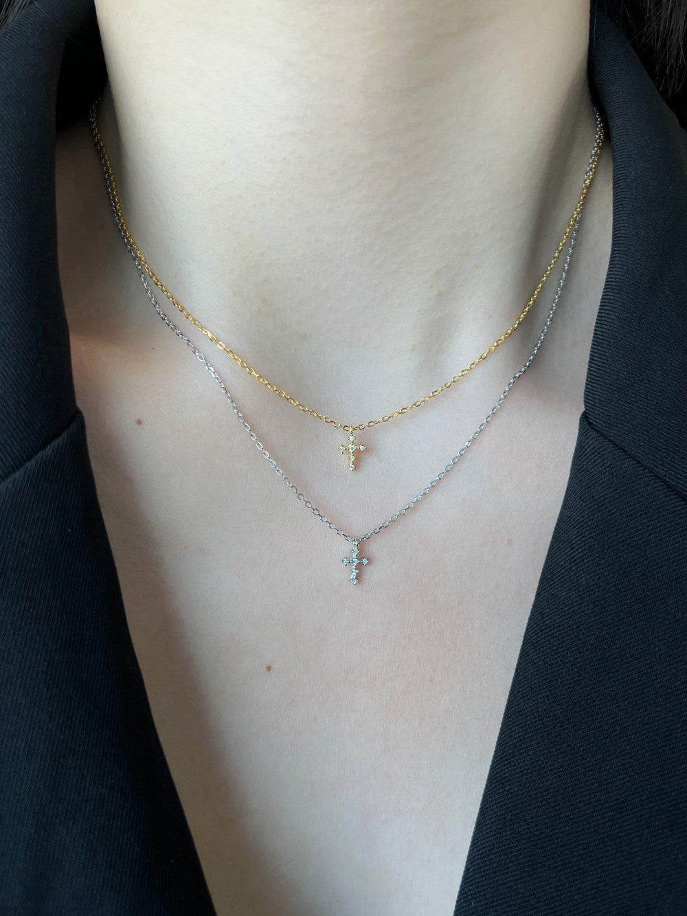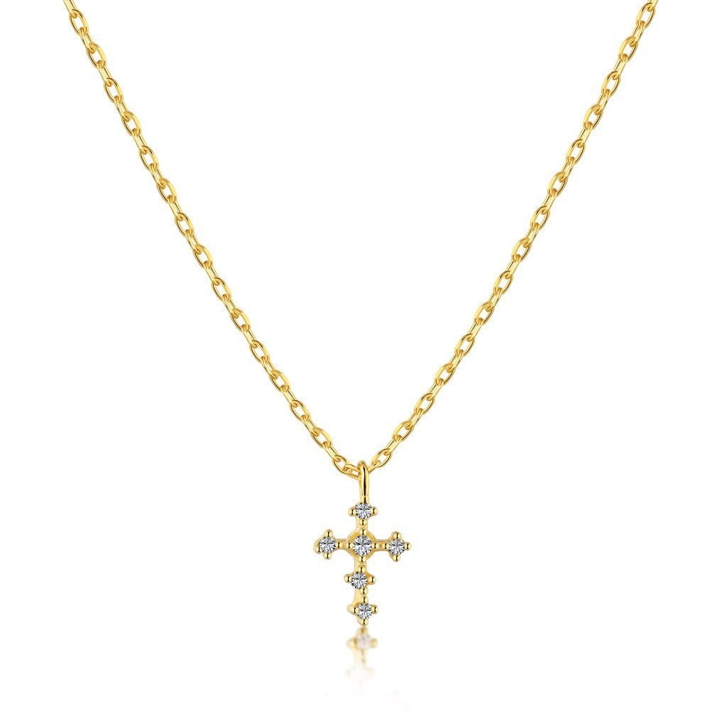 Dive into timeless elegance with this cross necklace, symbolizing spirituality and refinement. The golden chain highlights a cross pendant adorned with small sparkling stones at each end, adding a luminous and sophisticated touch to the ensemble. Perfect for enhancing all your outfits, this Cross necklace stands out with its harmonious design that captures the essence of faith and beauty. Whether worn daily or for special occasions, it expresses impeccable style while remaining a meaningful testament to your commitment.
