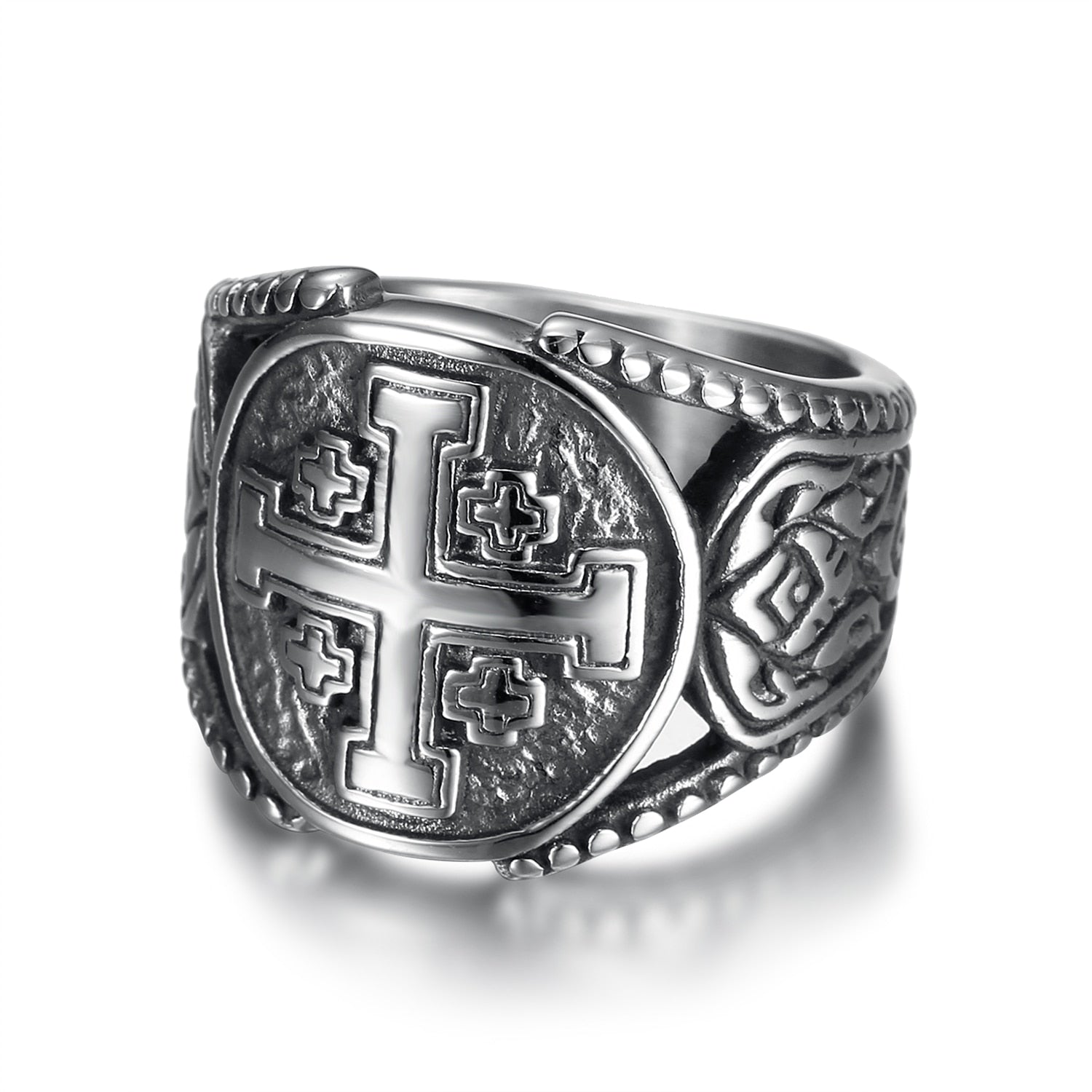 Discover the Jerusalem Cross Signet Ring, a captivating piece of jewelry featuring a large central cross motif, highlighting intricate engraved details. Its wide design and complex side patterns add an artistic dimension, perfect for expressing your unique character and faith.